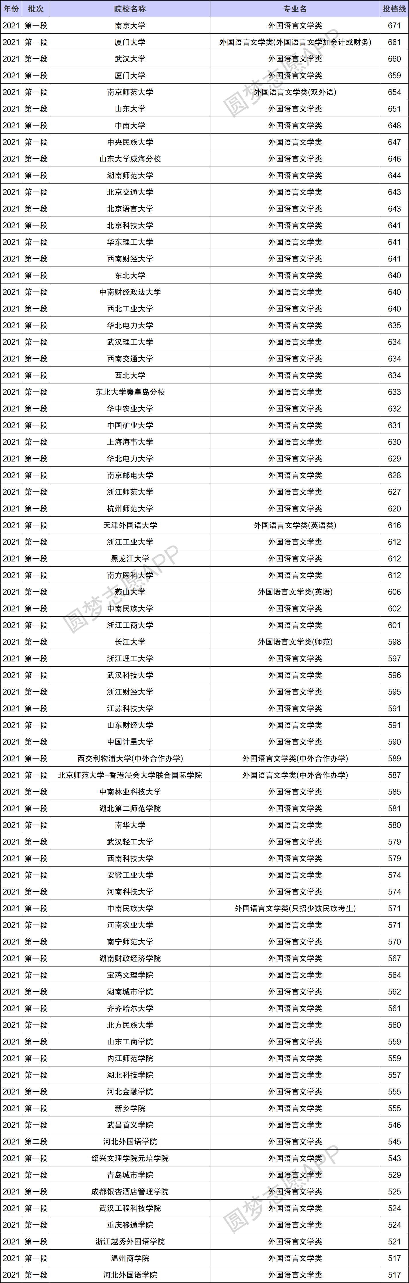 二、外国语言文学专业大学排名录取分数线