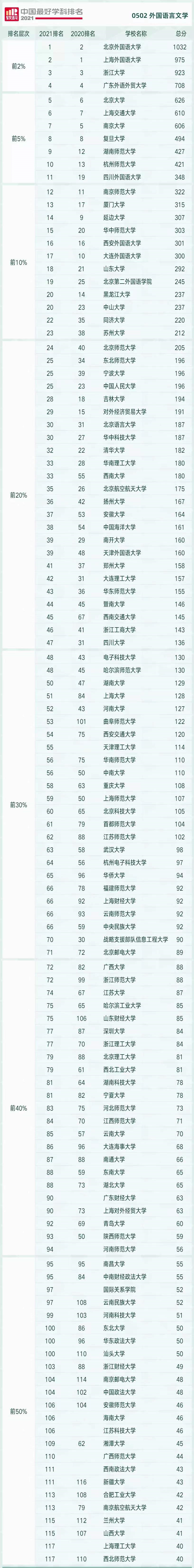 根据2021年软科发布的中国最好学科排名——外国语言文学篇,国内实力最强的两所大学分别是北外和上外。