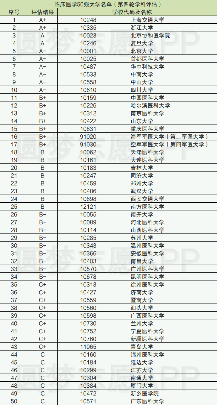 小编根据9教育部全国第四轮学科评估整理了一下,国内临床医学最好的50所大学名单,供大家参考。另外大家也可以通过查看到这些大学的办学情况、学校分数线、专业分数线、学科实力、毕业生就业前景、招生规定等相关信息。