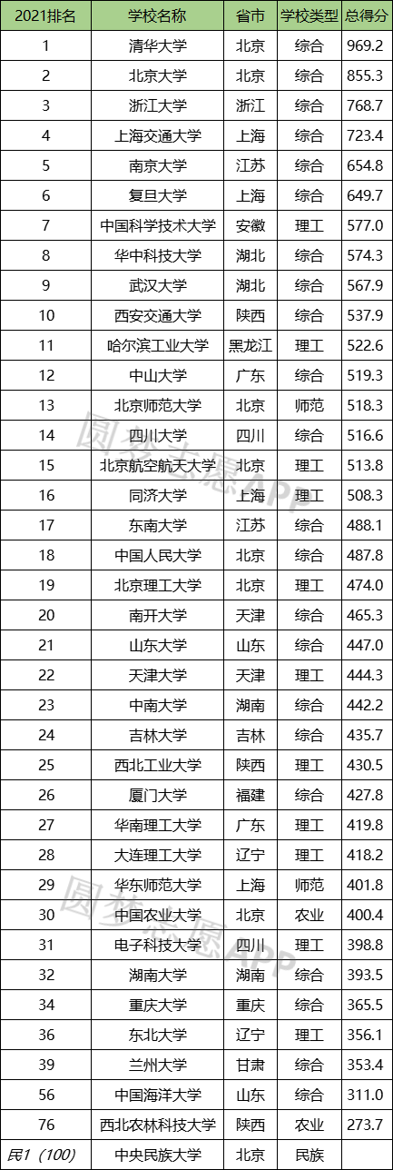 目前全国一共有39所985高校,在软科2021中国大学排名中,38所985高校参与了排名,国防科技大学由于性质特殊没有参与。2021年全国985大学全列表及排名情况如下,其中顶尖的985大学莫过于清华和北大,其次浙江大学、上海交通大学以及南京大学也跻身全国前5强高校之列。排名较为靠后的985是西北农林科技大学(76名)和中央民族大学(100名),这两所大学虽然是985里面“最差”的,但是综合实力仍然在全国百强高校以内,因此也是值得考生报考的重点大学。