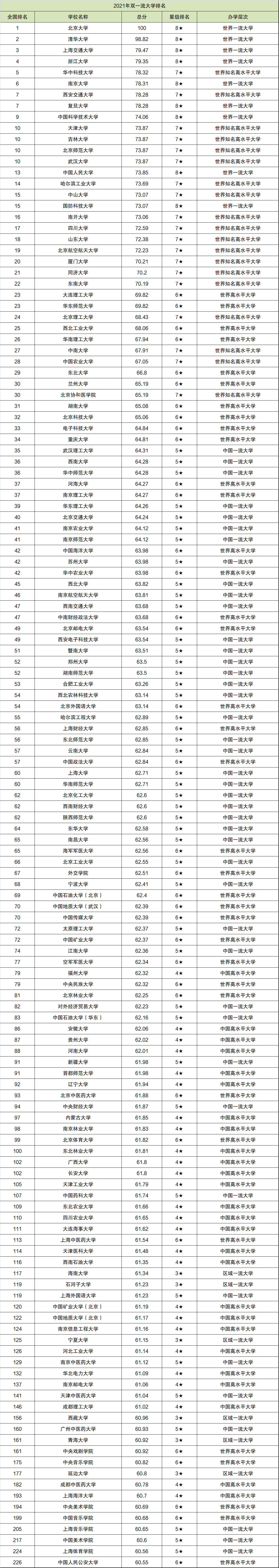 2021年全国双一流大学排名: