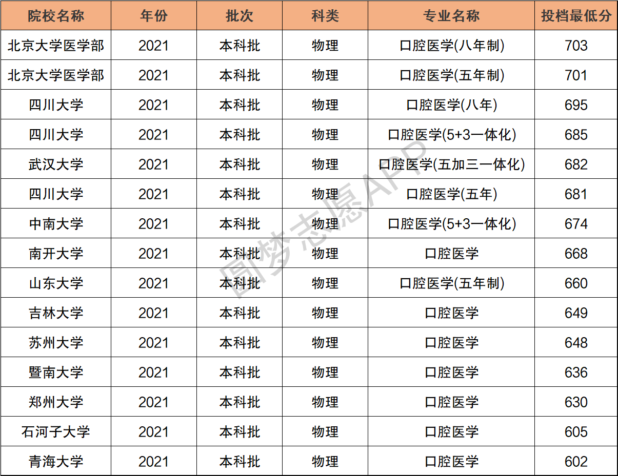 根据2021年高校各专业在重庆市的物理类最低投档线,小编整理了211大学口腔医学专业分数线排名,如下图: