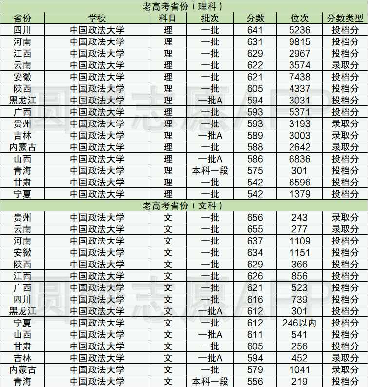 2021年政法大学在老高考省份的分数线表