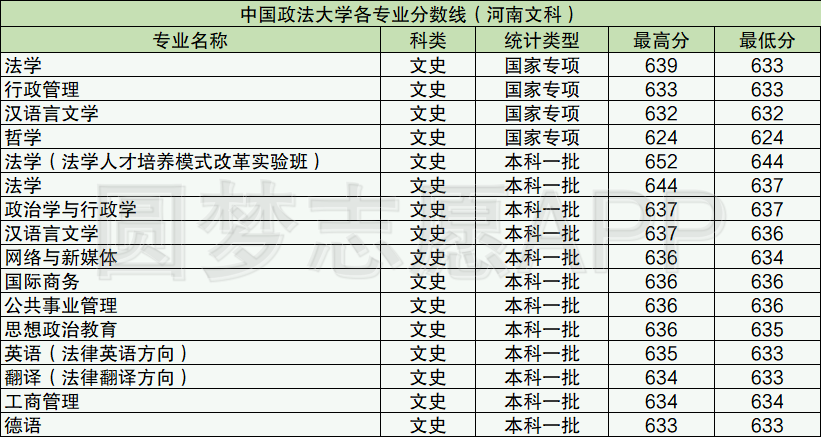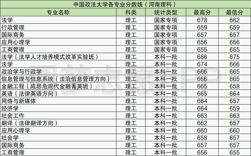 由于中国政法大学官网目前还没公布2021年各专业的最新的录取分数线,因此小编这里为大家整理的是政法大学2020年各专业的分数线,以河南省为例。