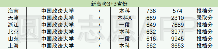 从政法大学在新高考“3+3”省份的分数线来看,最高的是在海南的投档分,736分,位次574;最低的是在上海的投档分,562分,位次3653。