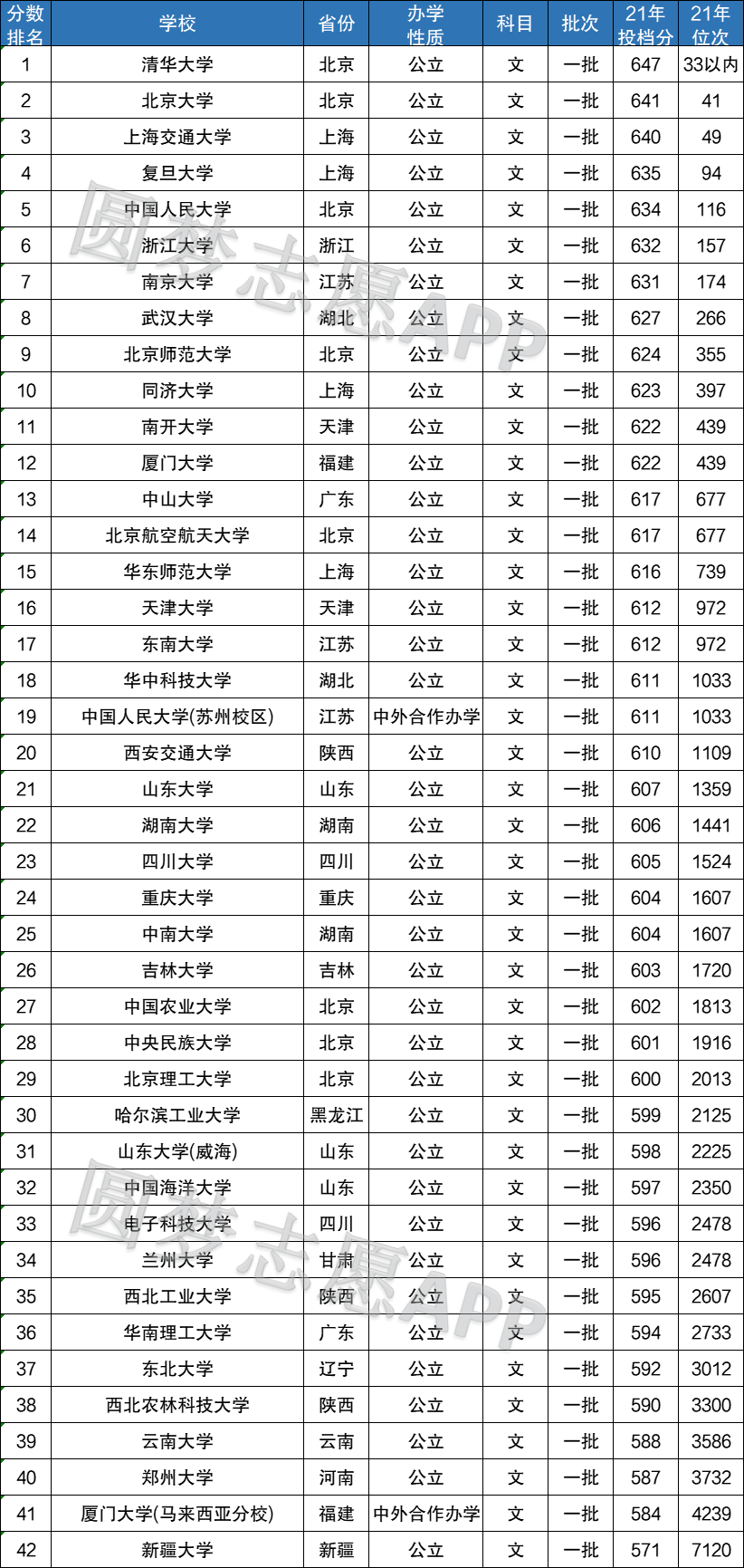 从双一流在四川省文科的数据中,我们可以得知双一流大学录取最高的为清华大学,2021年最低分为647分;录取最低的为新疆大学,2021年录取最低分为571分。