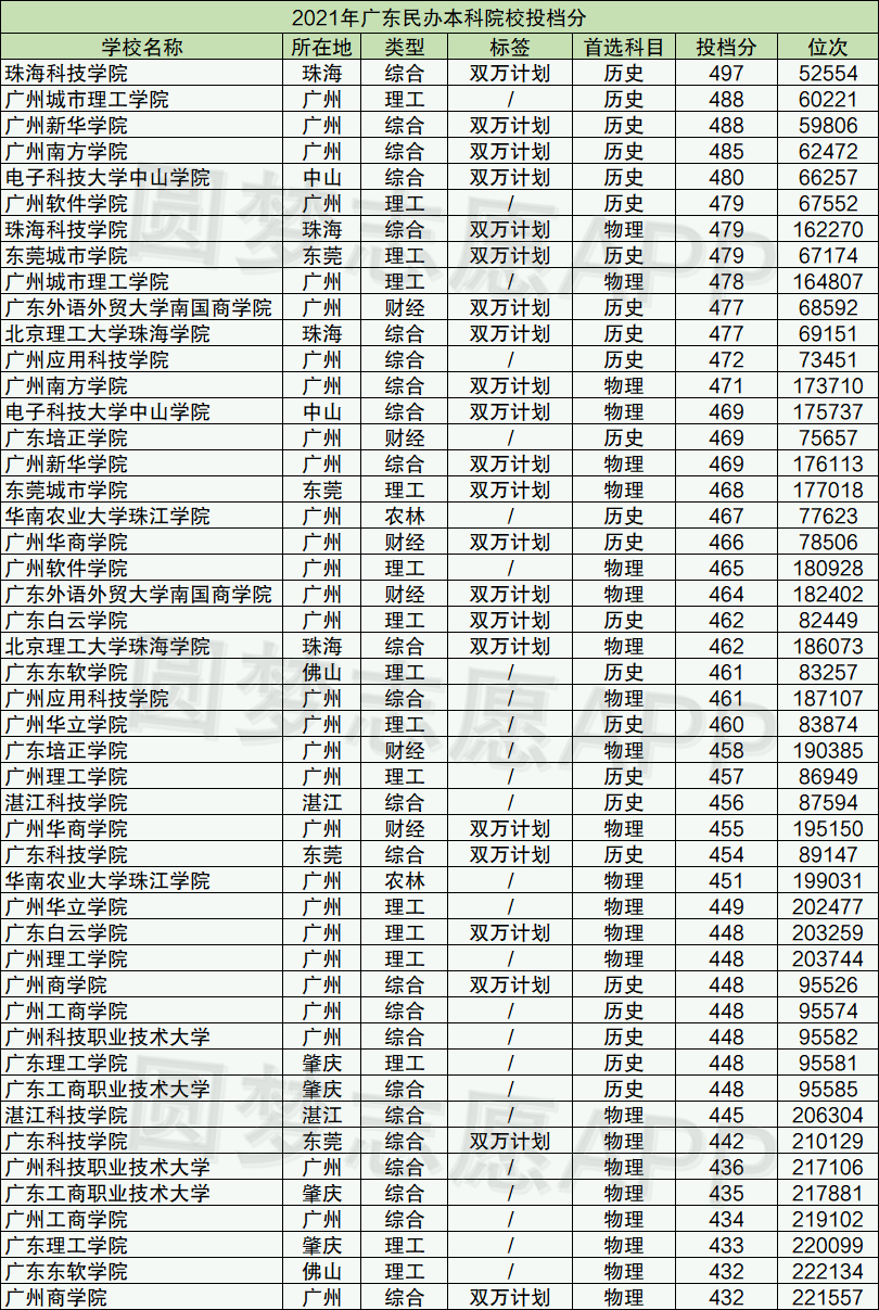 从上表来看,2021年广东民办本科院校中在广东本省物理组投档分最低的是广州商学院,432分,位次221577,该校是双万计划高校之一。历史组分数最低的是广东工商职业技术大学,448分,位次95585。