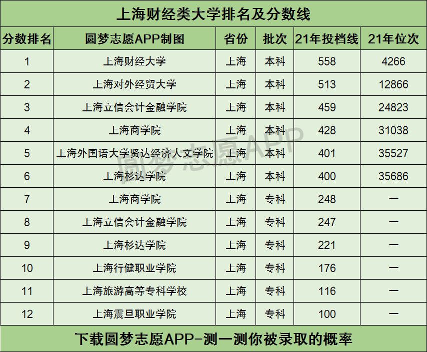 2021年高考在上海本科招生的财经大学为:上海财经大学、上海对外经贸大学、上海立信会计金融学院、上海商学院、上海外国语大学贤达经济人文学院、上海杉达学院;