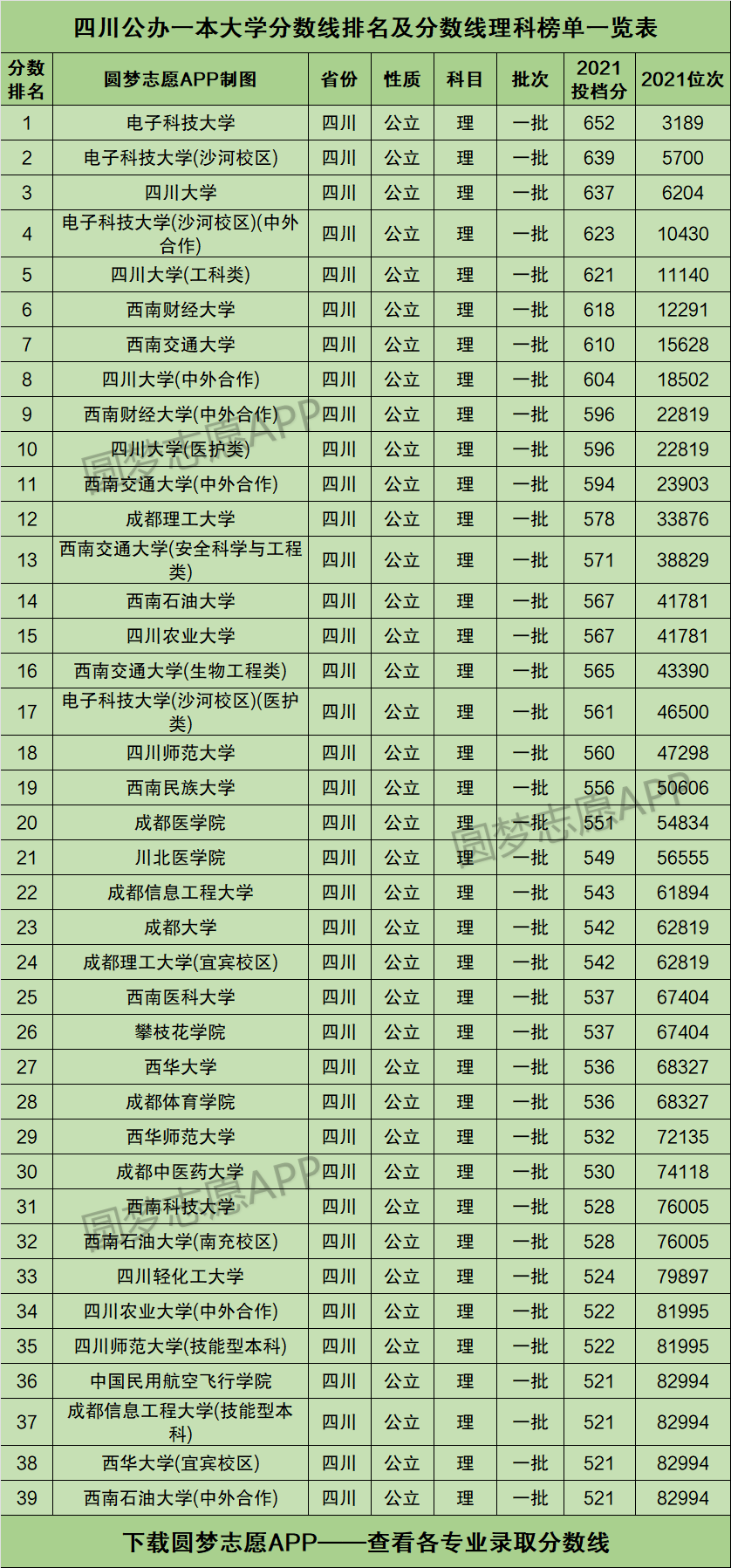 以各校2021年在四川理科的投档分数线的高低为标准进行排名,为大家展示出下图这份四川所有公办一本大学的投档分数线排名,大家可以对照着位次看看自己能读四川省内的哪一所公办一本: