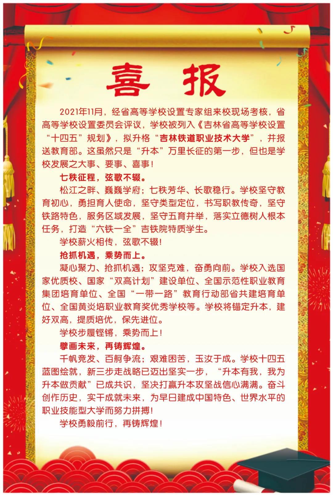 有些专科学校在自身努力发展和社会需要的情况下,会被升格为本科学校,在之前就有吉林忒到职业技术学院会升本的消息,但是一直都是道听途说,网上也有很多人问:“吉林铁道职业技术学院什么时候升本?”;“吉林铁道职业技术学院是几本?”的等一些问题,最紧吉林铁道职业技术学院官方发布了一则《喜报》,我们一起来看看。