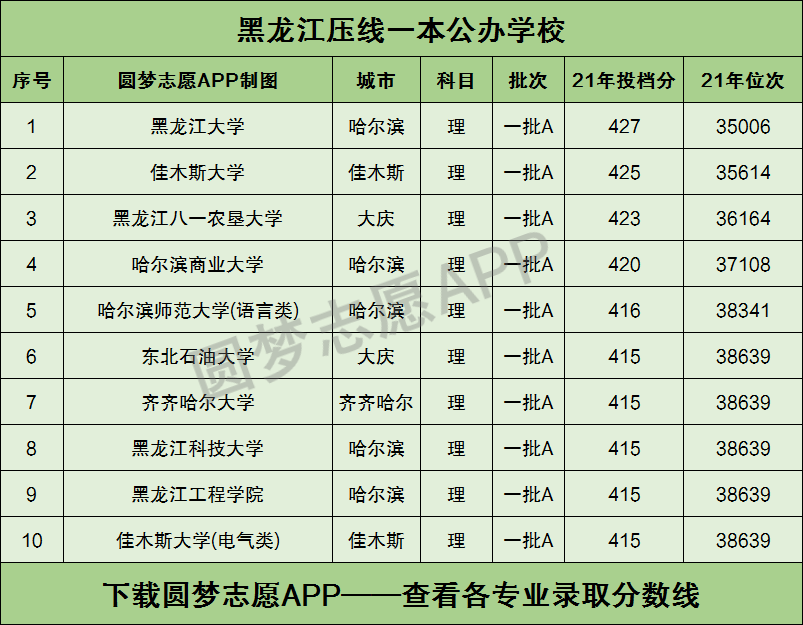 黑龙江省2021年高考理科一本线为415分,这也就意味着2022年的考生至少要与一本线一致、排在黑龙江省理科前38639名,才有机会留在黑龙江省内读一所一本公办大学。