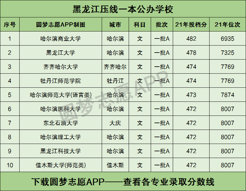 黑龙江省文科2021年高考一本线为472分,这也就意味着2022年的黑龙江文科考生,高考成绩至少要与一本线一致、排在黑龙江省文科前8007名,才有可能在黑龙江省内读上一所公立的一本大学。
