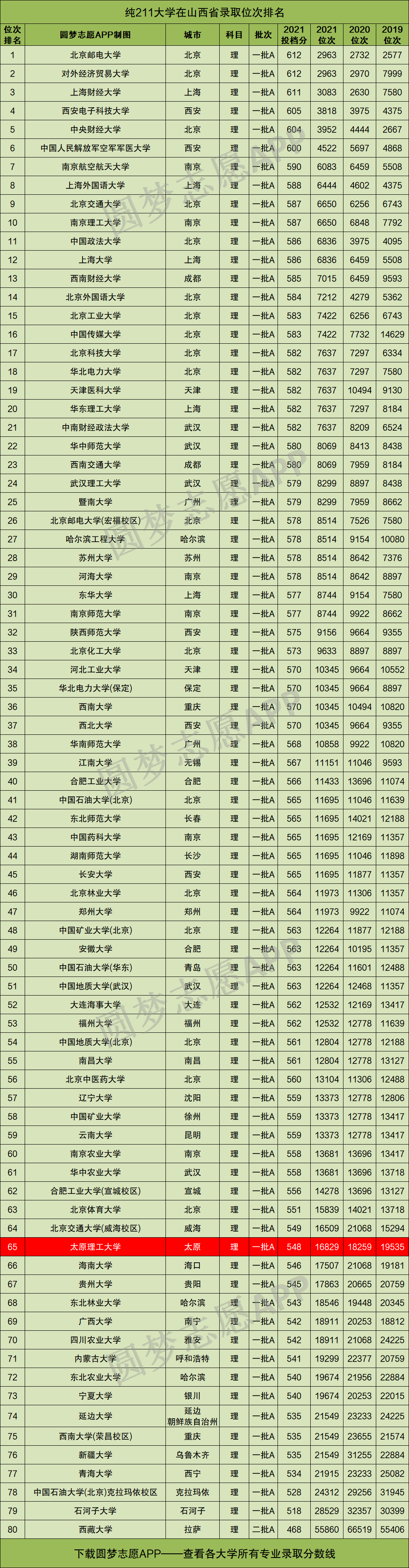 下图为,全国非985的纯211大学在山西省理科的位次排名,以2021年最低位次为标准进行的排序。其中太原理工大学排在第65位: