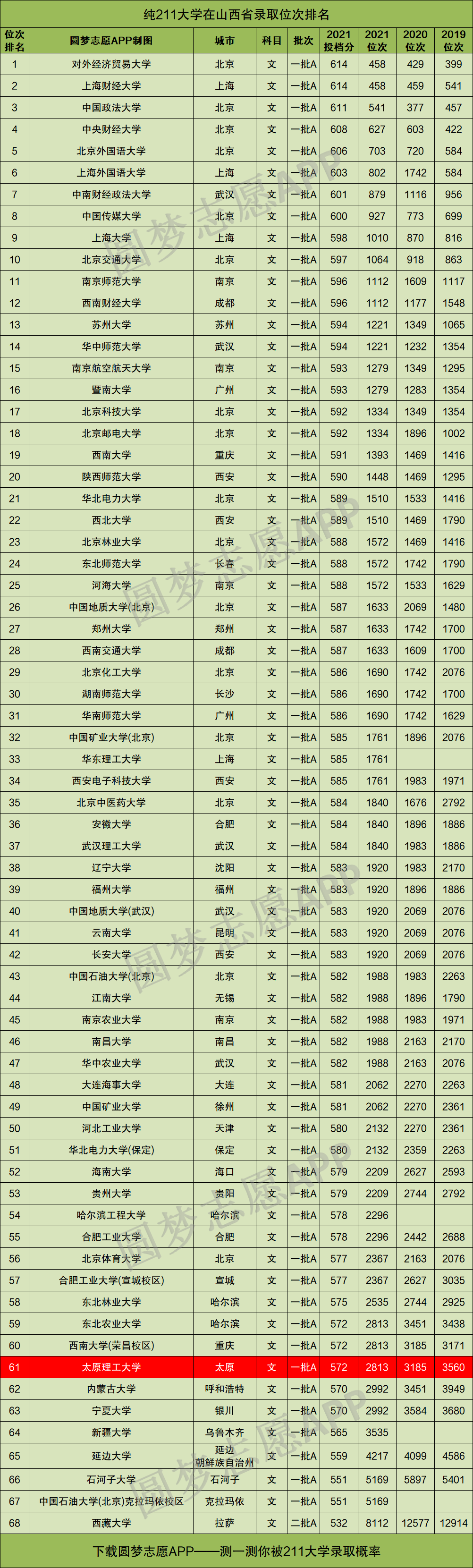 下图为全国非985的纯211大学在山西省文科的录取位次排名,其中太原理工大学排在纯211大学中的第61名。
