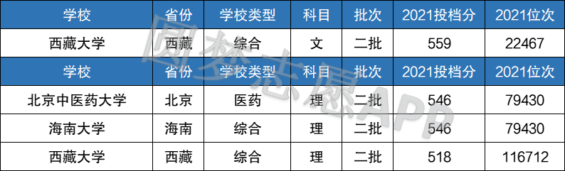 理科:北京中医药大学(546分)、海南大学(546分)、西藏大学(518分);