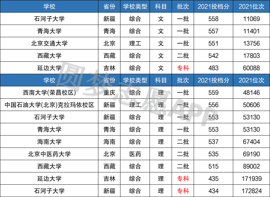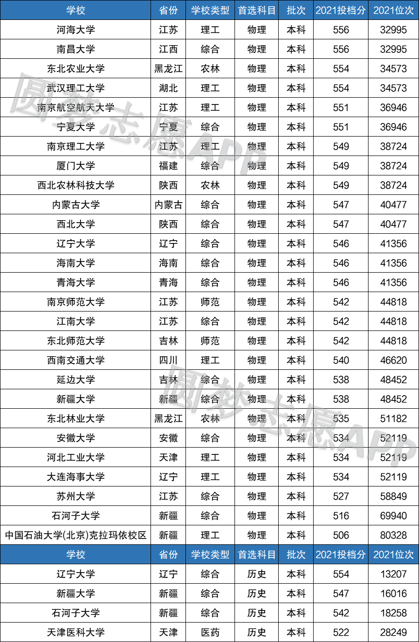 首选历史:辽宁大学(554分)、新疆大学(547分)、石河子大学(542分)等。