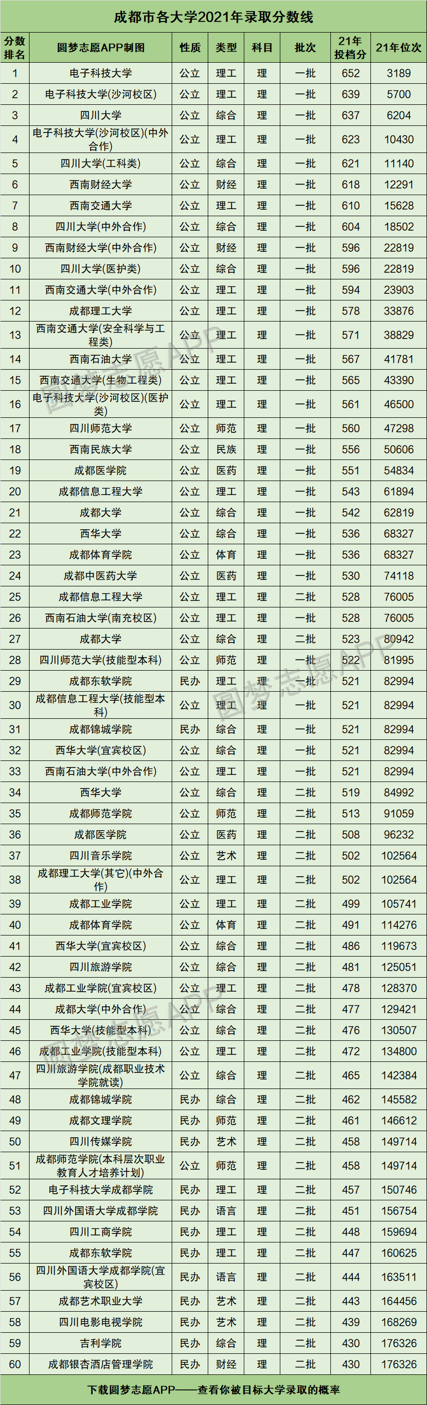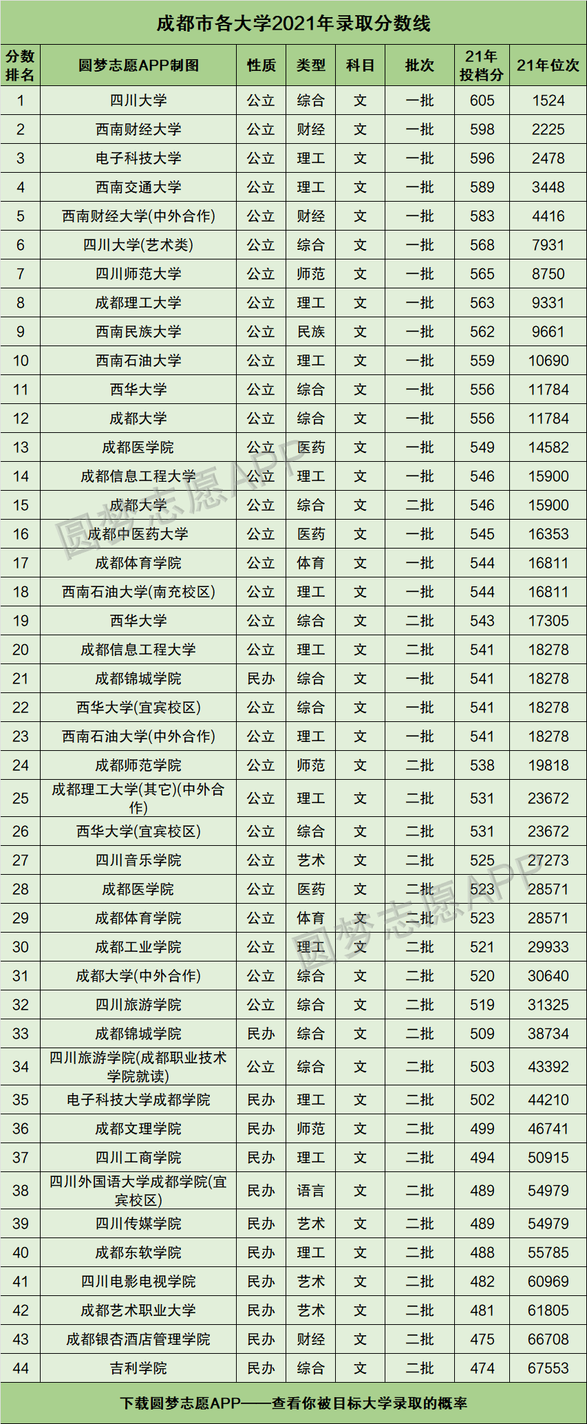 成都各个大学2021年最新录取分数线排名,是每一位成都即将参加2022年高考的同学所必备的资料。本文将为大家奉上这份数据,希望成都的每一位高三同学都能圆梦大学、被成都的好大学录取!