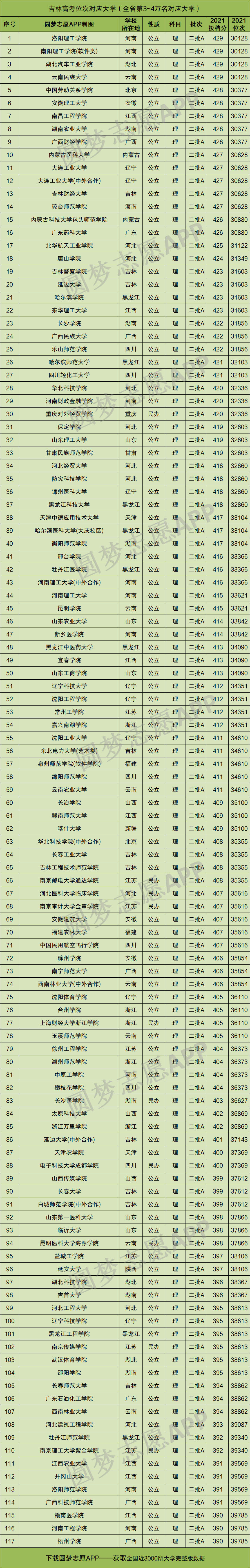 根据上图可知,2021年吉林高考理科本科第3万名至4万名对应的大学有117所。而在这个名次范围内收分最低的十所大学分别是: