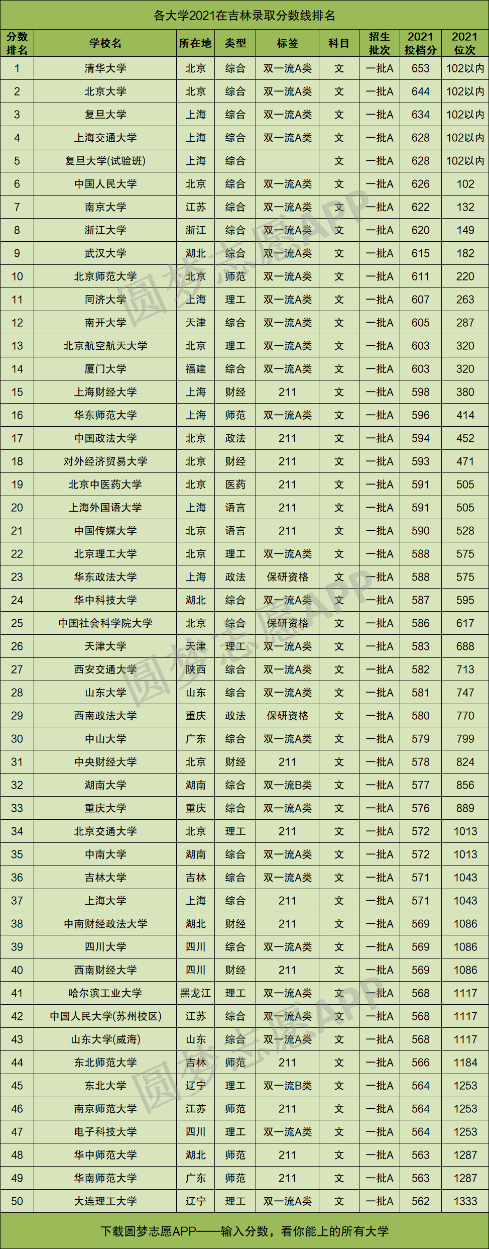 小编按照各大学2021年在吉林文科考生中的投档分数线的高低排序,为大家整理了在吉林收分最高的前50所大学排名及分数线。