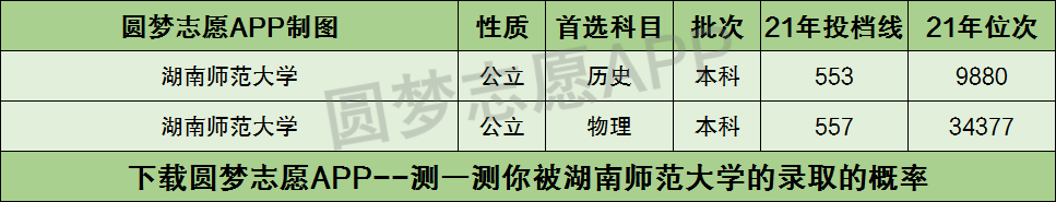 根据上图可知,湖南师范大学2021年在湖南省历史类的投档分数线为553分,物理类的投档分数线为557分。
