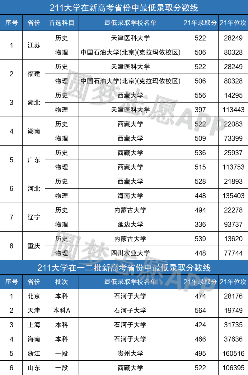 以下是211大学在新高考地区的最低录取情况:
