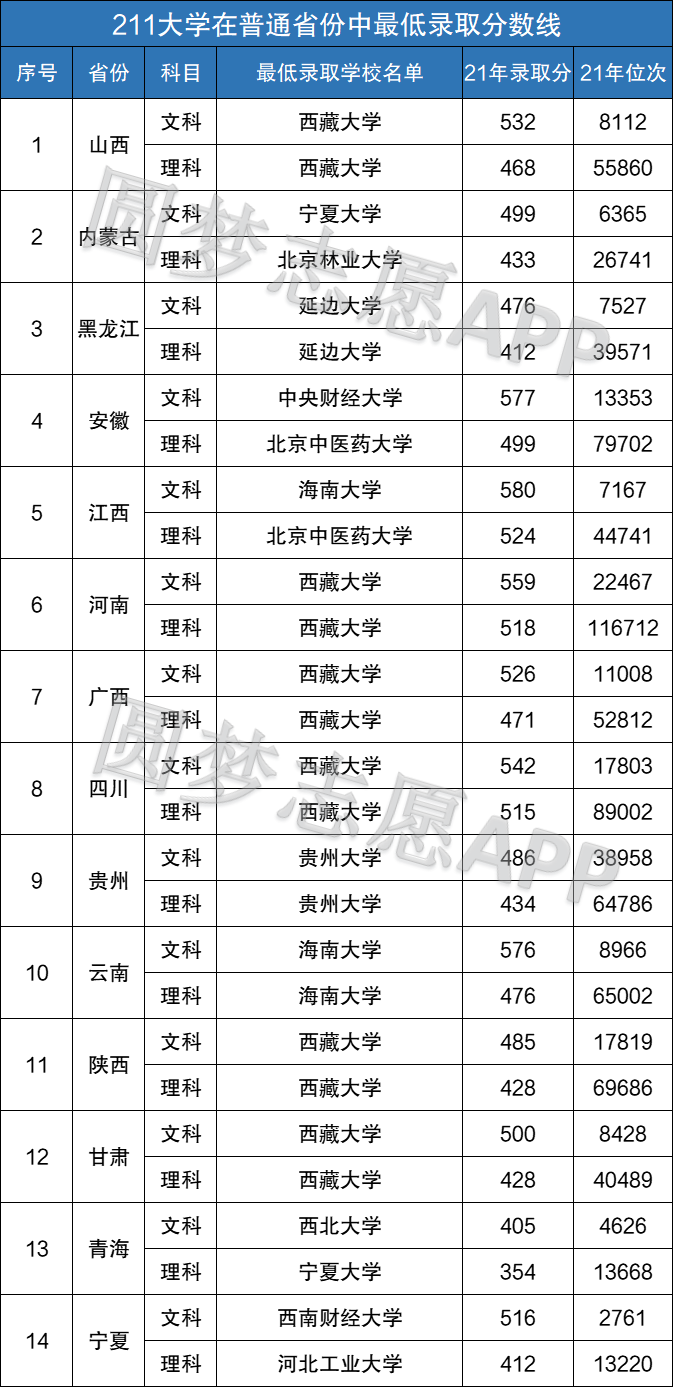 小编根据各省教育考试院公布的2021年的录取数据得知,发现在所有普通高考省份中,西藏大学在山西、河南、广西、四川、陕西、甘肃等省份的录取分数线最低,最低分为陕西、甘肃理科428分,可以说对于这两个省份的理科生来说,是最容易考取211高校的。