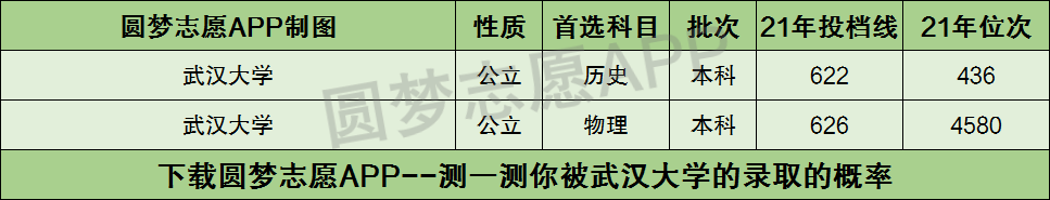 根据上图可知,武汉大学2021年在湖南省历史类的投档分数线为622分,物理类的投档分数线为626分。