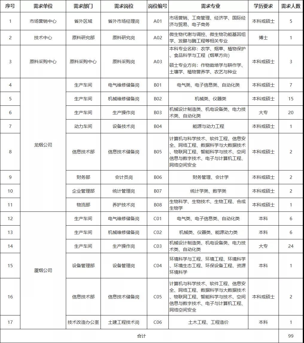 根据2021年福建省烟草公司发布的部分社会招聘情况来看,招聘岗位中仅部分岗位面向烟草专业毕业生,反倒是电气、机械、经贸类等专业的招聘人员更多。