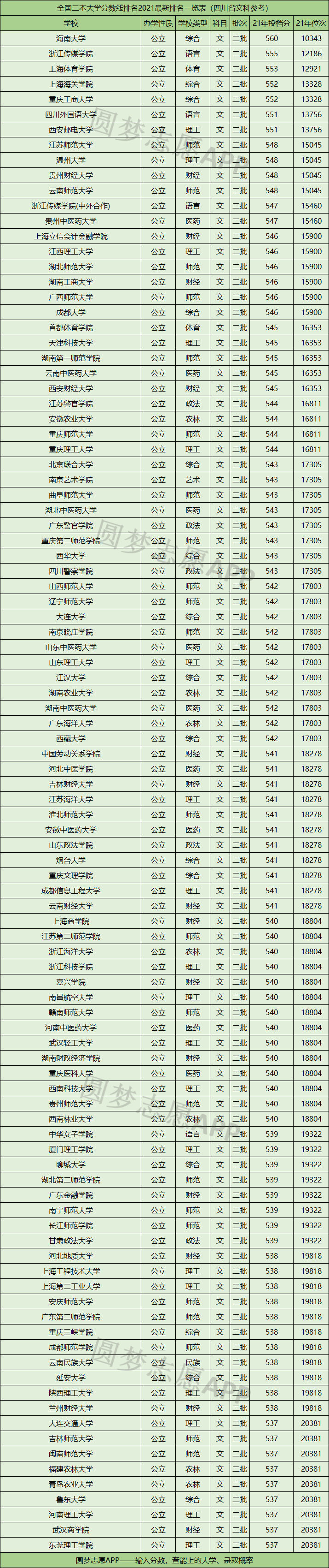 由于本文篇幅有限,仅为大家展示了录取分数线排名全国前一百强二本大学名单,根据表格数据可得知,四川文科考生需考到537分以上、全省排名前20381位前,才能被前一百强大学录取。全国文科二本大学录取分数线排名表完整榜单可在文末。