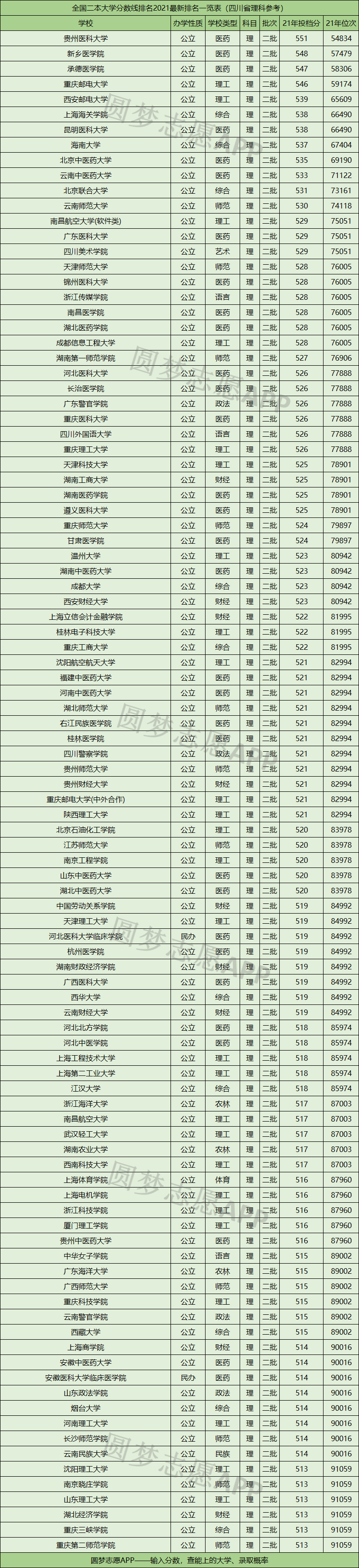 由于各大学录取分数线不一样,本文以高考大省四川省为例,为大家整理2021年全国二本大学在四川省录取分数线排名表。想了解其他省份二本大学录取分数线的考生,可。