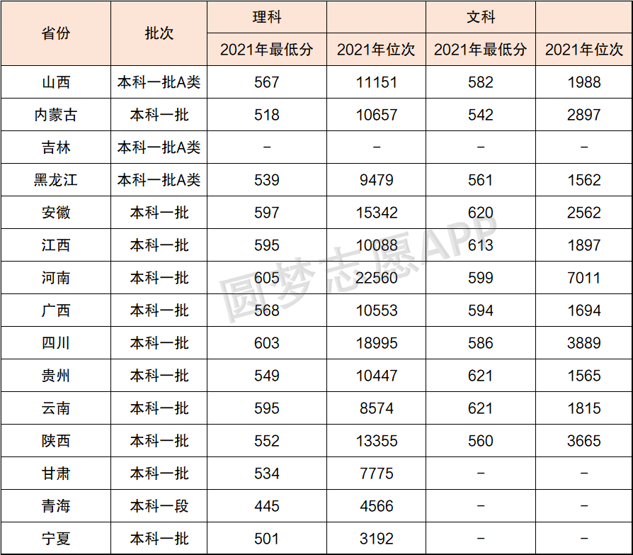 一所学校越好,那么报考热度就会更高,也能够反映学校一定的实力。老师整理出了该校2021年在全国普通省份和新高考省份的收分情况,整体来看,学校的分数是不低的,在高考大省的收分基本都是600分上下浮动,在其它省份的收分大多数都达到了550分以上。如果要考上该校的话,还是需要一定的实力才行。