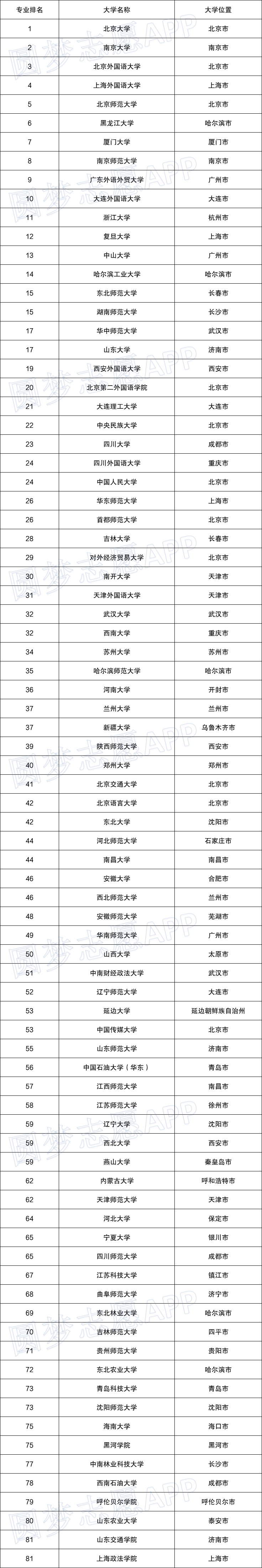 以下信息根据软科2021中国大学排名——俄语专业排名整理