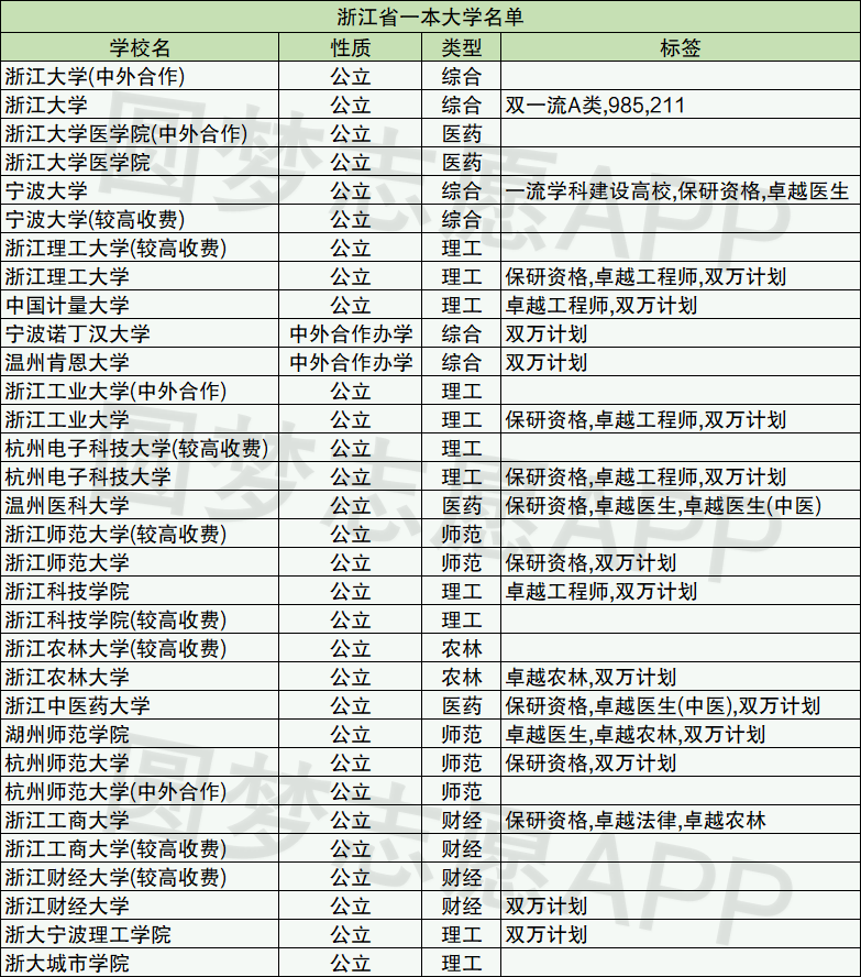 浙江是新高考省份,该省的录取批次主要分为一段和二段;一段中除了有本科大学之外也有职业学院;因此小编这里整理的是浙江省大学在仍分文理科、一二本的老高考省份本科一批录取的大学名单;