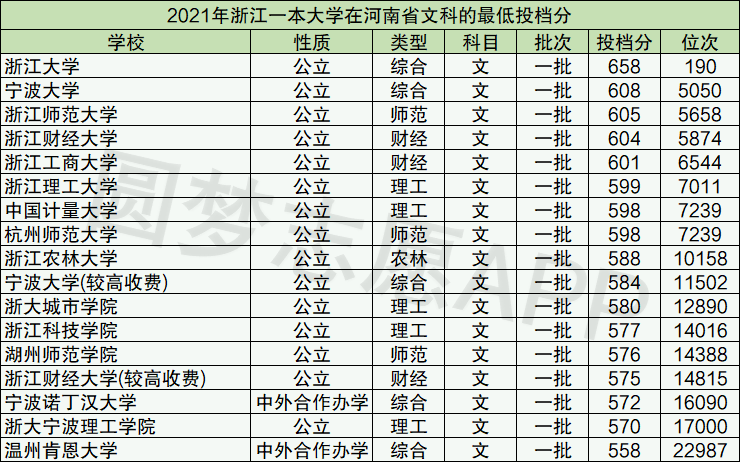 从上表可以看出,2021年浙江省一本大学在河南文科投档最低分,最高的仍然是浙江大学,其次是宁波大学、浙江师范大学、浙江财经大学、浙江工商大学;最低的也是温州肯恩大学(中外合作办学)、其次是浙大宁波理工学院和宁波诺丁汉大学(中外合作办学)。