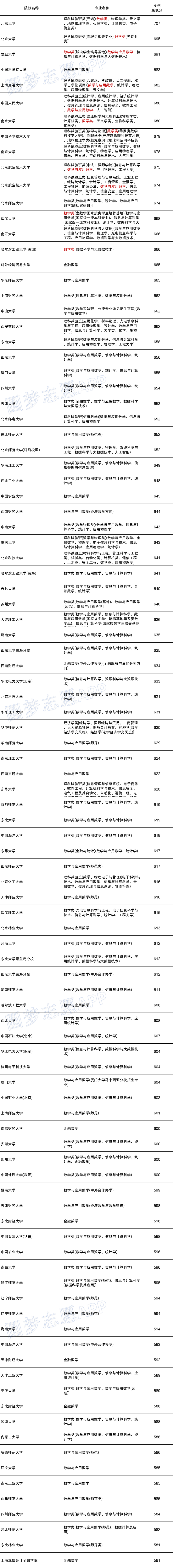 从上图我们可以看出,北京大学的理科实验班在辽宁省的录取分数线是最高的,在软科2021中国大学专业排名——数学与应用数学专业中,北京大学的数学与应用数学专业排名全国第1,复旦大学排名全国第2,这与由分数线高低的排名不谋而合。所以由分数线高低为条件,来给数学排名,是有实际意义的。所以考生可以参考以上排名。