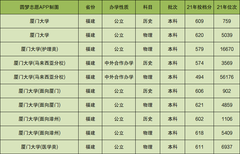厦门大学(面向厦门)2021年在福建省历史类的投档分数线为606分,物理类的投档分数线为621分。