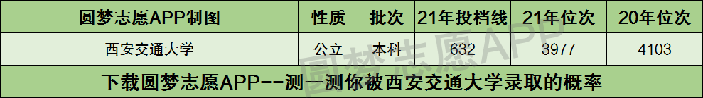 最后,小编也要提醒大家:报考大学时参考大学三年最低位次,只能保证你被西安交通大学录取。但如果你想知晓自己被西安交通大学哪些专业录取的概率比较高的话,那么一定要看自己的高考位次超过了西安交通大学哪些专业三年的位次!(手机应用市场,可查看全国所有大学及专业近三年的录取分数线和位次,测一测你被目标大学录取的概率是多少!)
