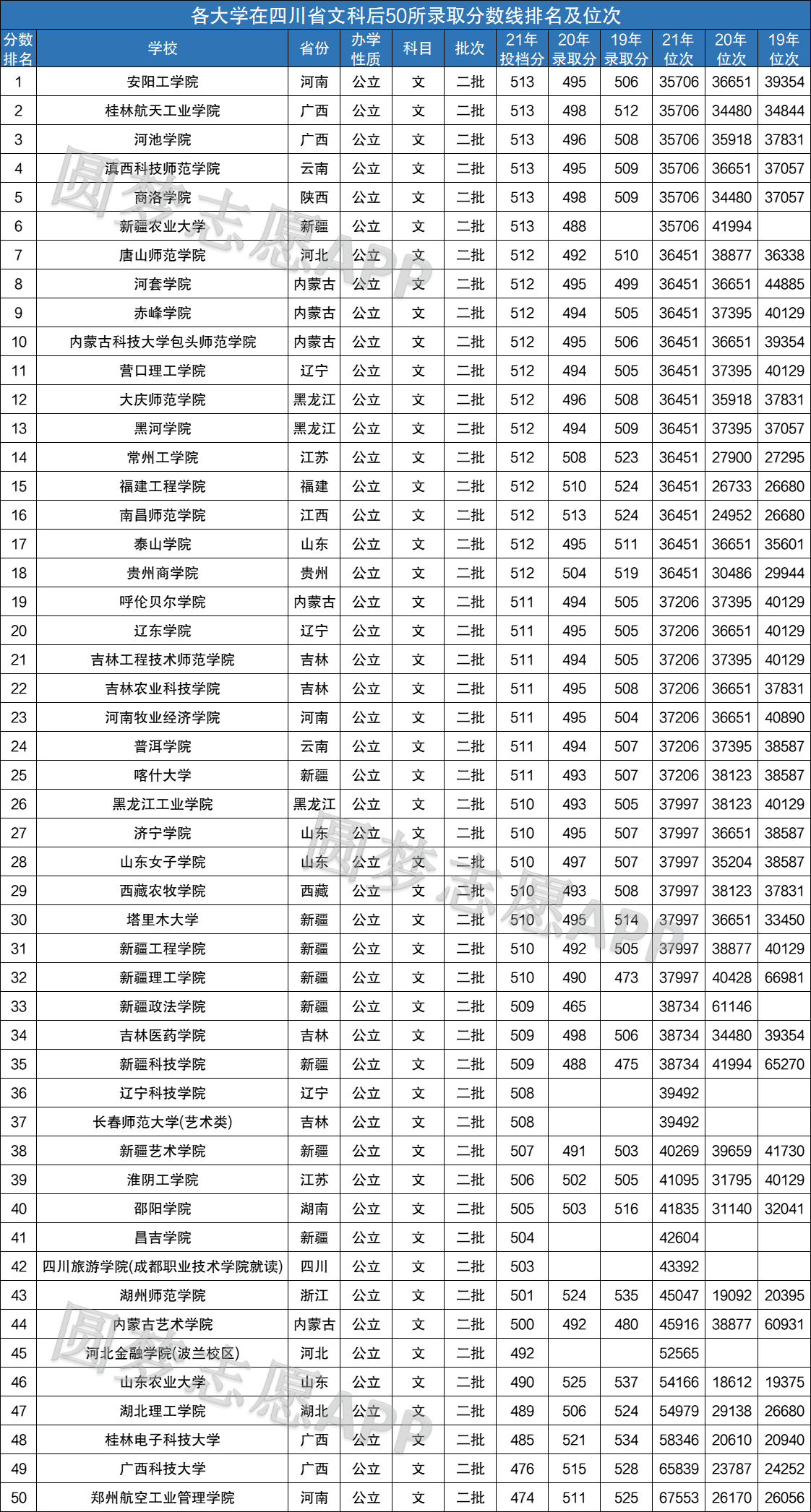 以下是各大学在四川省文科后50所录取分数线排名及位次: