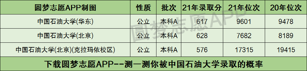 最后,小编也要提醒大家:报考大学时参考大学三年最低位次,只能保证你被中国石油大学录取。但如果你想知晓自己被中国石油大学哪些专业录取的概率比较高的话,那么一定要看自己的高考位次超过了中国石油大学哪些专业三年的位次!(手机应用市场,可查看全国所有大学及专业近三年的录取分数线和位次,测一测你被目标大学录取的概率是多少!)