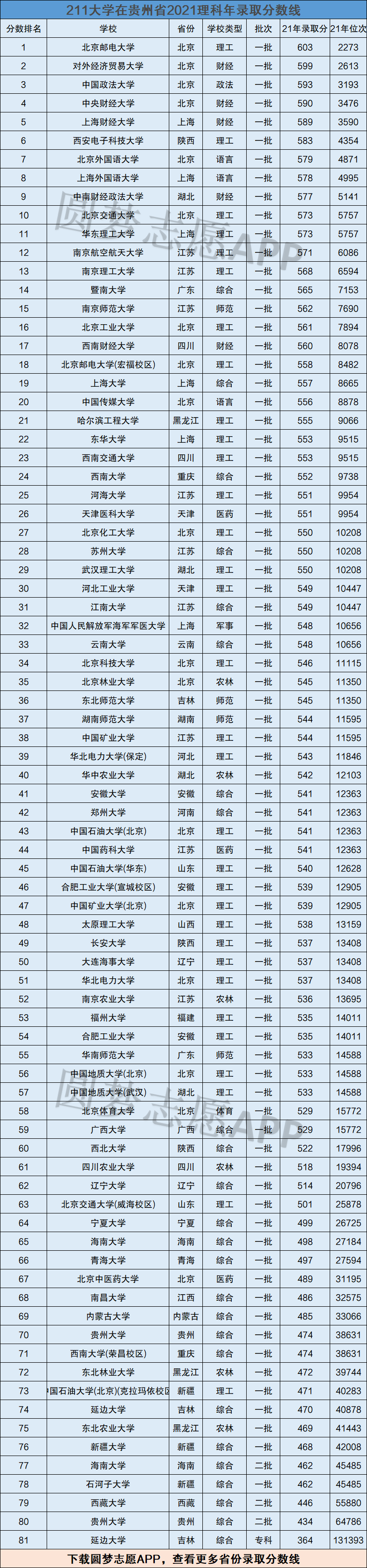 下面是211大学2021年在贵州省理科类的排名及录取分数线