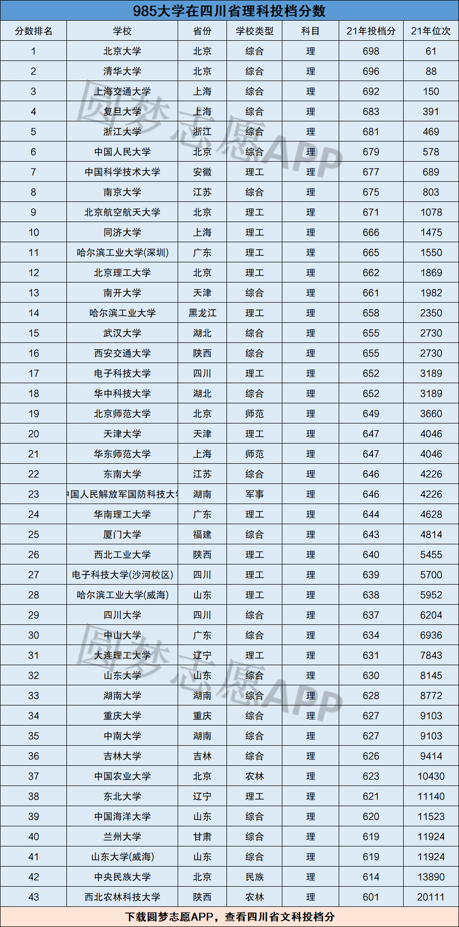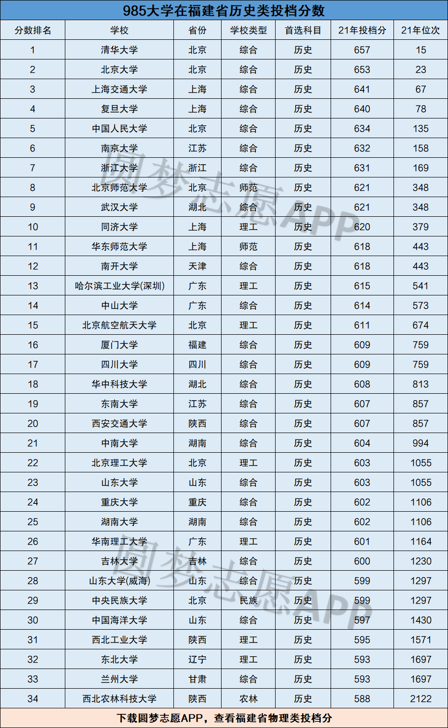 由于每所大学在不同的省份录取分数线不一样,而篇幅有限,所以小编就列举出985大学2021年在福建、四川两省的录取分数及排名供大家参考,下面是完整榜单。大家也可以,查看985大学2021年在全国全省的排名及录取分数线。