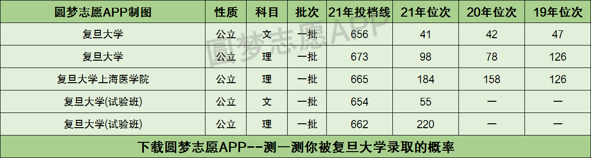 最后,小编也要提醒大家:报考大学时参考大学三年最低位次,只能保证你被复旦大学录取。但如果你想知晓自己被复旦大学哪些专业录取的概率比较高的话,那么一定要看自己的高考位次超过了复旦大学哪些专业三年的位次!(手机应用市场,可查看全国所有大学及专业近三年的录取分数线和位次,测一测你被目标大学录取的概率是多少!)