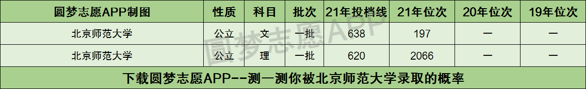 最后,小编也要提醒大家:报考大学时参考大学三年最低位次,只能保证你被北京师范大学录取。但如果你想知晓自己被北京师范大学哪些专业录取的概率比较高的话,那么一定要看自己的高考位次超过了北京师范大学哪些专业三年的位次!(手机应用市场,可查看全国所有大学及专业近三年的录取分数线和位次,测一测你被目标大学录取的概率是多少!)