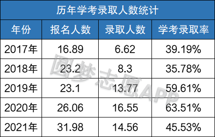 以上是小编为大家整理的近五年来广东学考的录取人数统计,从这五年来的报名情况看,学生们的报考热情都非常高,报考人数也在逐年增加。2021年广东学考报名人数已经突破31万人,从2020年到2021年,语数英学考报名人数直接上升了5万余人,按照这个趋势发展,我们不难预见,2022年参加广东学考的考生人数将会大幅度的增加,甚至可能会突破37万余人(此观点仅是小编个人看法,供参考)。