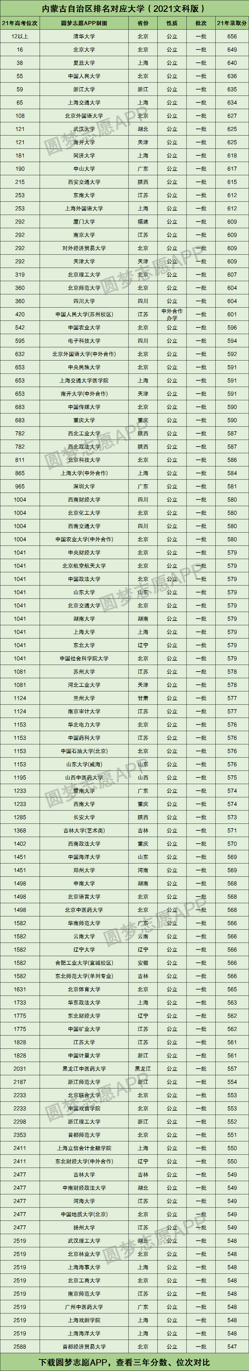 下图为2021年高考内蒙古文科录取位次最高的前100所大学的具体名单,其对应的文科位次为全区前2588名。