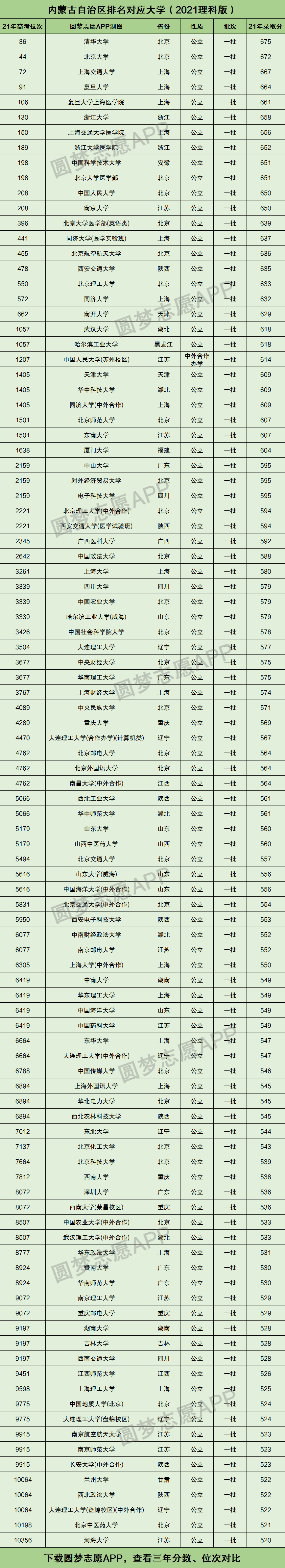 一、内蒙古自治区排名对应大学(理科版)