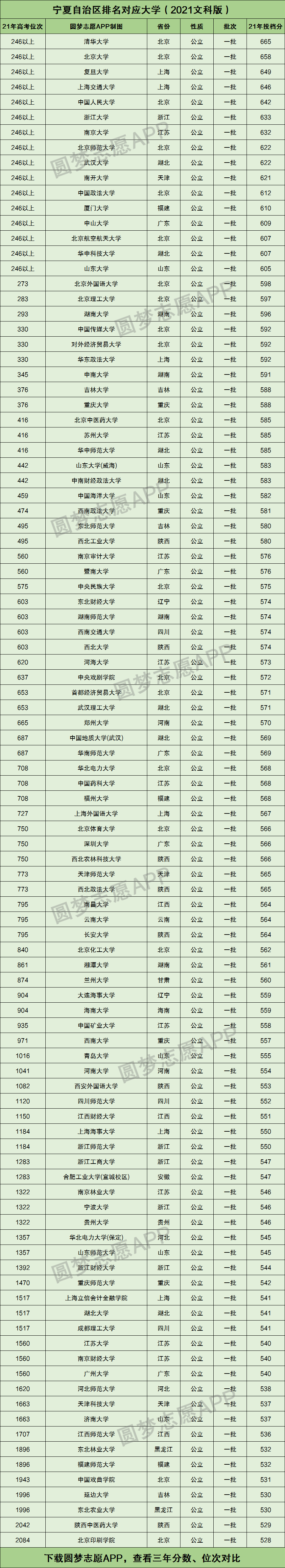 下图为2021年高考宁夏文科录取位次最高的前100所大学的具体名单,其对应的文科位次为全区前2084名。