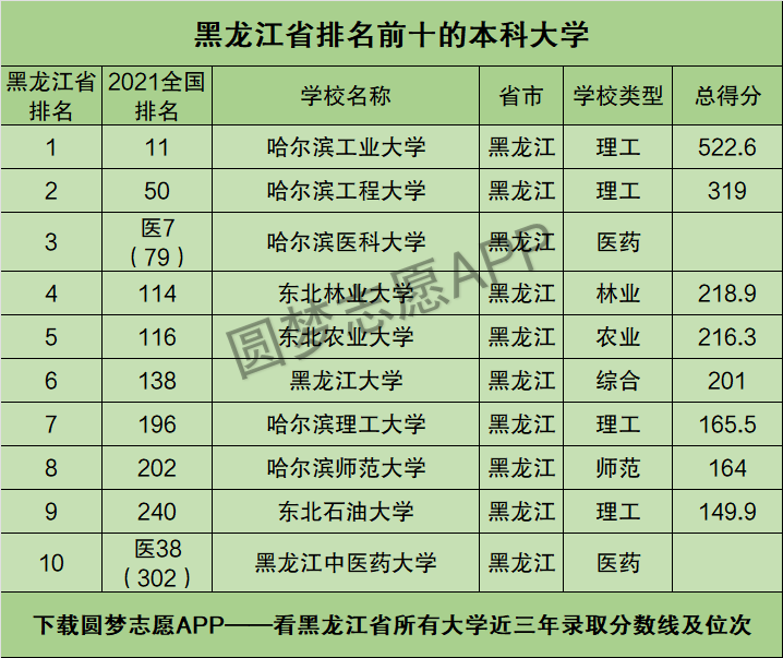 根据2021软科中国大学排名总榜,为大家整理出了位于黑龙江省内且排名前十名的本科大学名单,具体学校名单和排名数据如下: