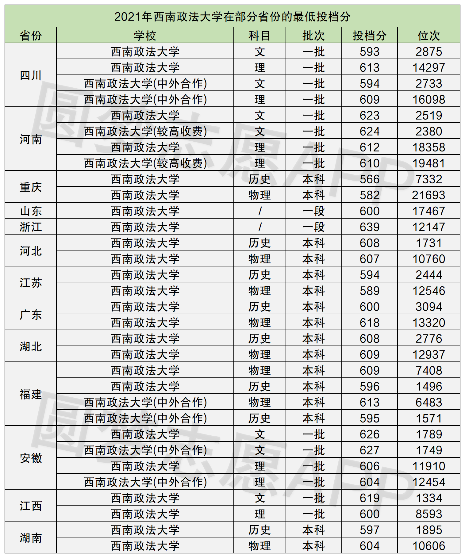 从下表来看,2021年西南政法大学最低投档分,最低的是在重庆本地(历史组),566分,位次为7332;最高的的是在浙江省的639分,位次为12147。另外位次最低的也是在重庆本地(物理组)位次21693,分数582;位次最高的是江西(文科)位次1334,分数619。