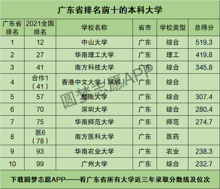 下图中,为大家整理了广东省排名前十的本科大学的全国排名以及总得分情况。